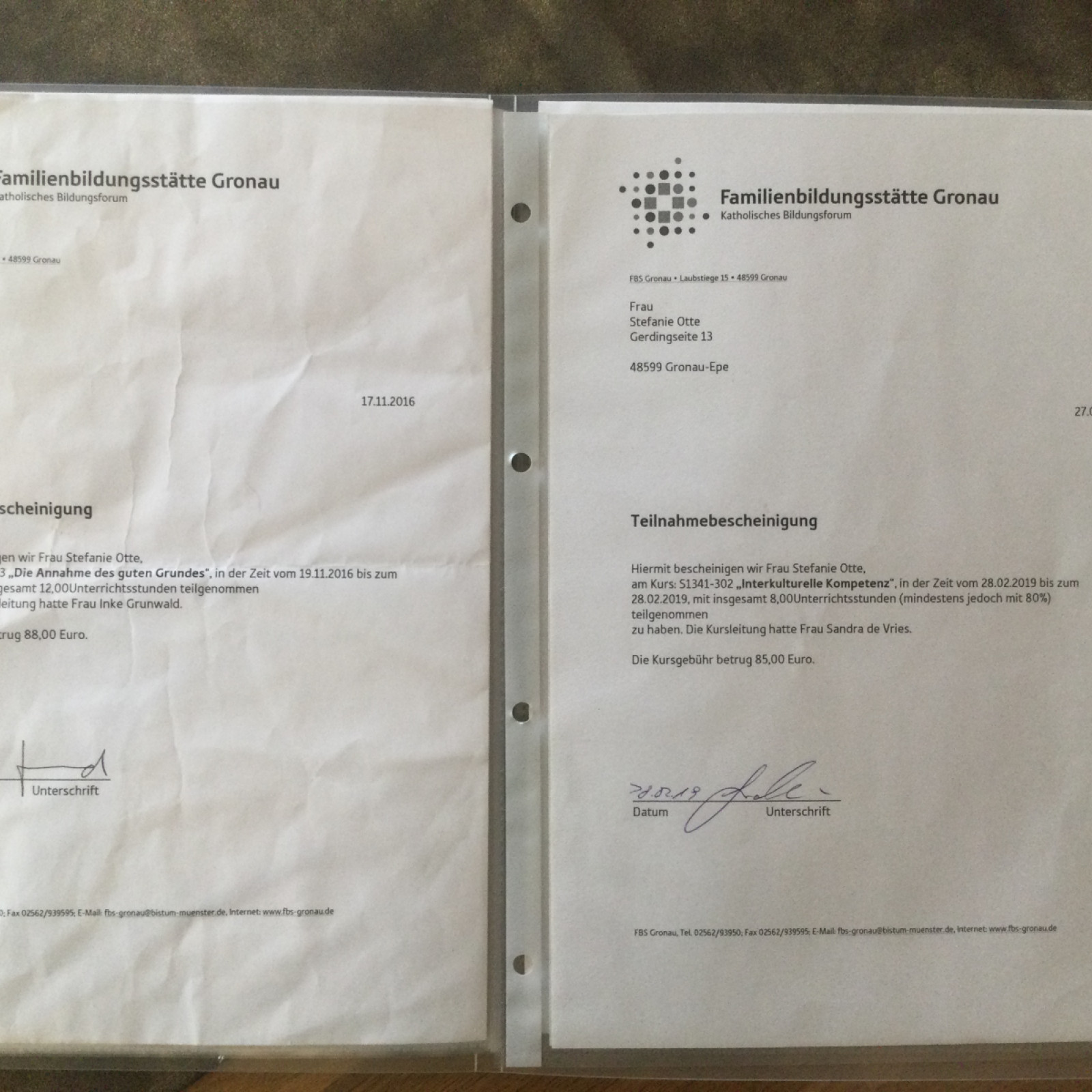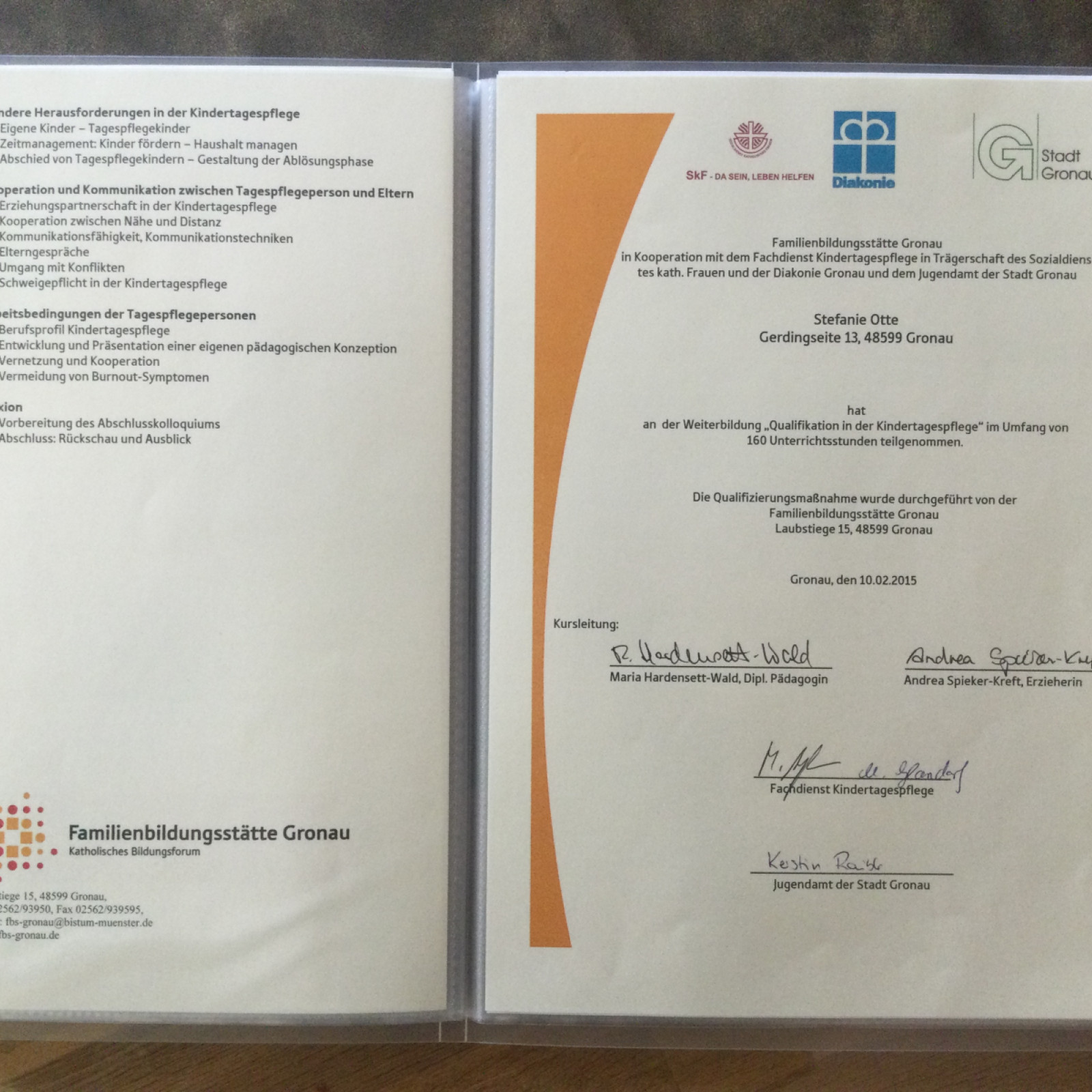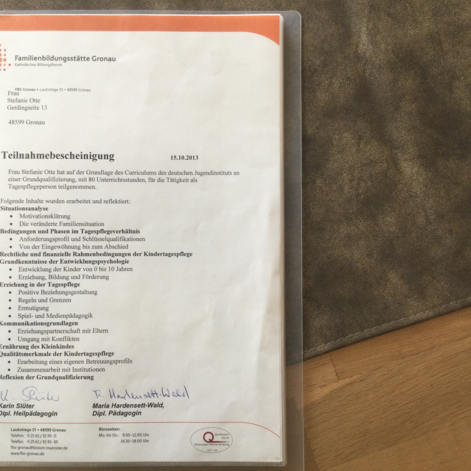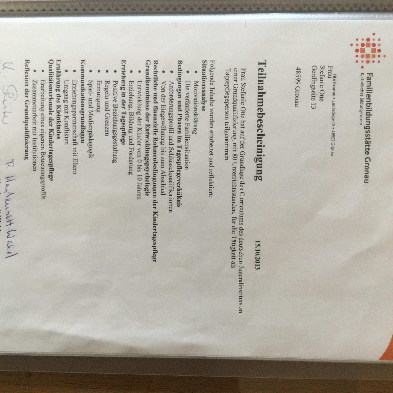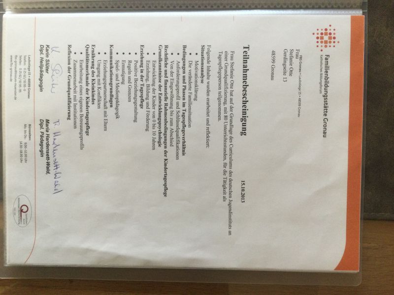 Als qualifizierte Kindertagespflegeperson „Tagesmutter“ habe ich eine Ausbildung absolviert. Jedes Jahr nehme ich mindestens einmal an Fortbildungen teil. Das Auffrischen meines „Erste Hilfe Kurs für Kleinkinder“ alle zwei Jahre ist selbstverständlich und auch Pflicht. Ebenso die „Infektionsschutzbelehrung „ .Folgende Fortbildungen habe ich besucht: